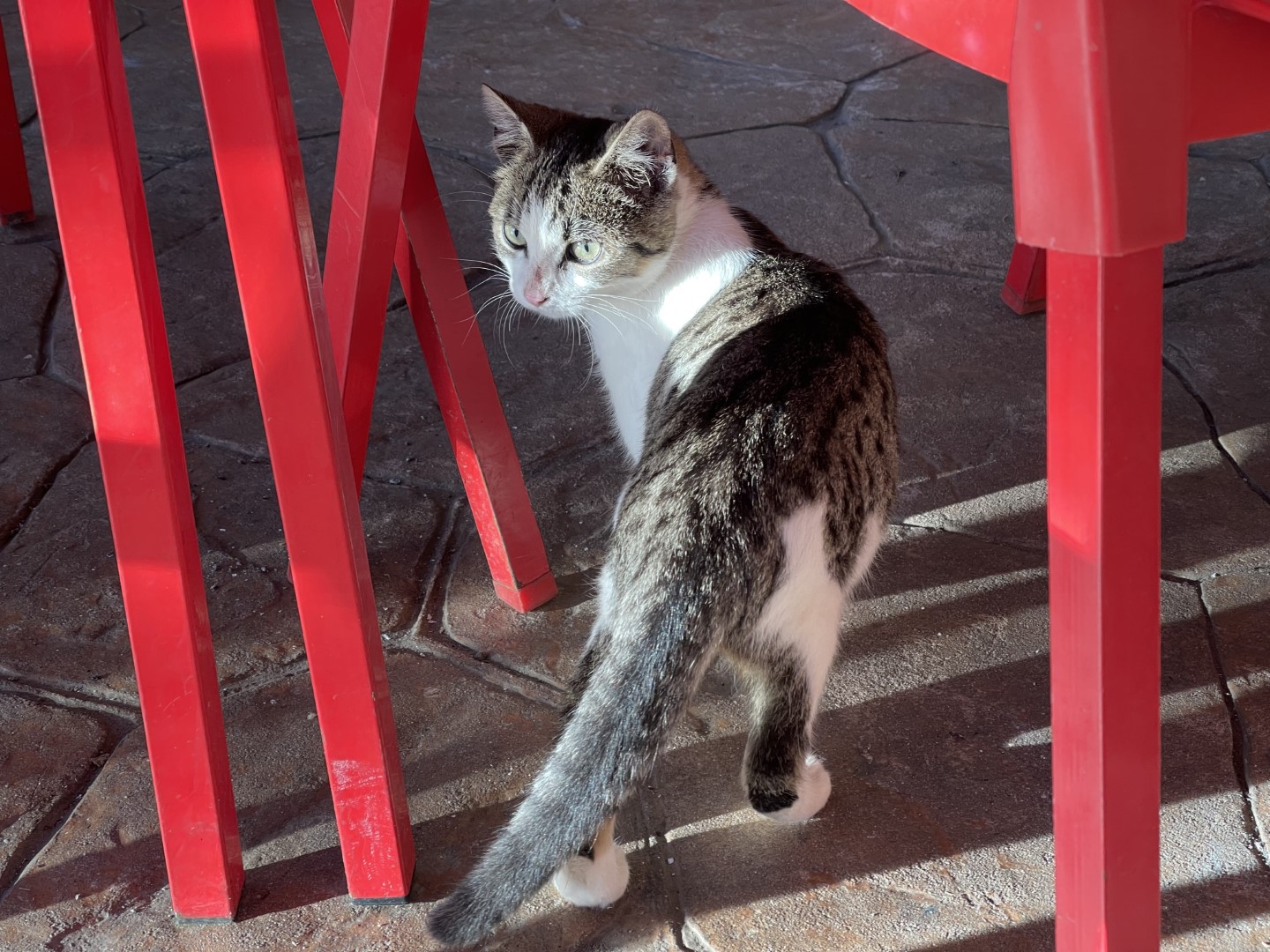 I stopped for some juice in the hilltop town of Foncebagón. Every Spanish café is endowed with an orange juicing machine filled to the brim with bruised oranges, even in tiny Foncebagón, and I gave my legs a rest while teasing a gray and white tabby that was circling the cafe tables.