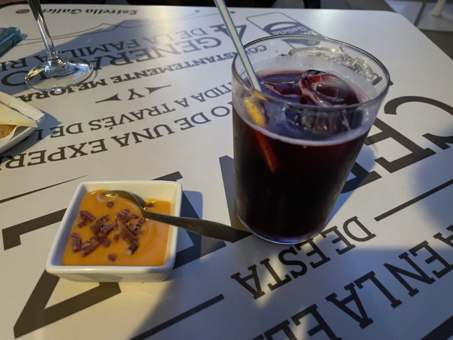After massaging my poor feet for an hour, I went out and enjoyed a crappy burger with a Heineken and talked to a German girl who had sat down across from me and refused to make eye contact until I said hello, at which point she brightened up and spoke to me in rapid fire German. I attempted to respond with the only German phrase I knew: “Ich sprieche kein Deutsch”. Regardless of whether she understood my sentence, she understood that I didn’t speak German and switched to perfect English. I still have no idea why she would lead with German. After dinner, we enjoyed 3€ glasses of sangria with finger-sized bowls of salmorejo, my favorite soup in the world.
