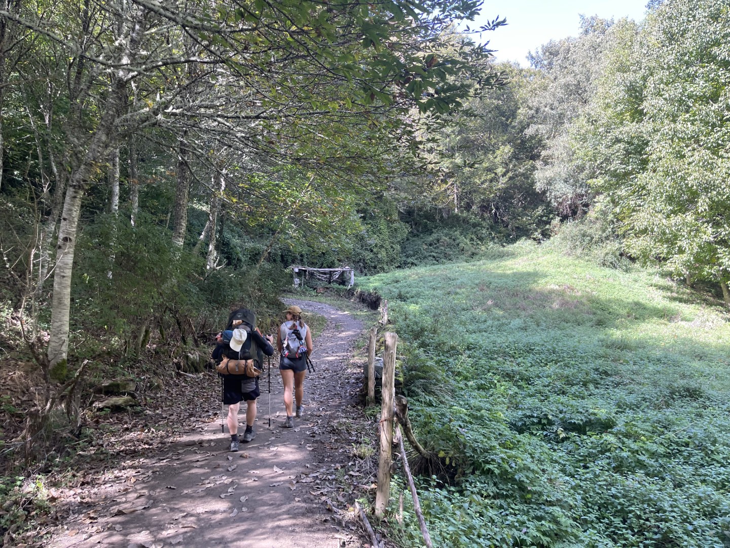 I emerged from the forest into a fairy tale landscape. A few pilgrims had scaled the barbed-wire fence into the cow pastures and created their own makeshift picnic site overlooking the forested valley below.