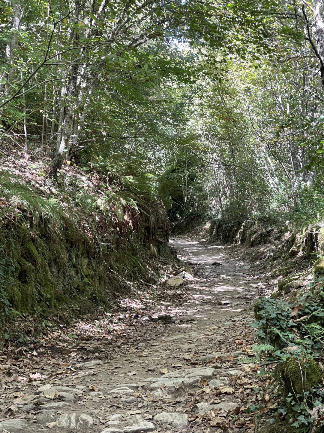 At around 1pm, I arrived at the hardest part of my1 Camino. Veteran pilgrims the previous night had warned me about it: a 5km long, 700m vertical climb on nonstop switchbacks through dense forest, all at the tail end of a 30km day. To make matters worse, the trail was littered with horse shit covered in black fleas that would swarm you if you stepped too close to said horse shit. But the uphill was so exhausting and the horse shit so dense that I had no choice but to rest every minute or two by a pile of horse shit and get swarmed by fleas.