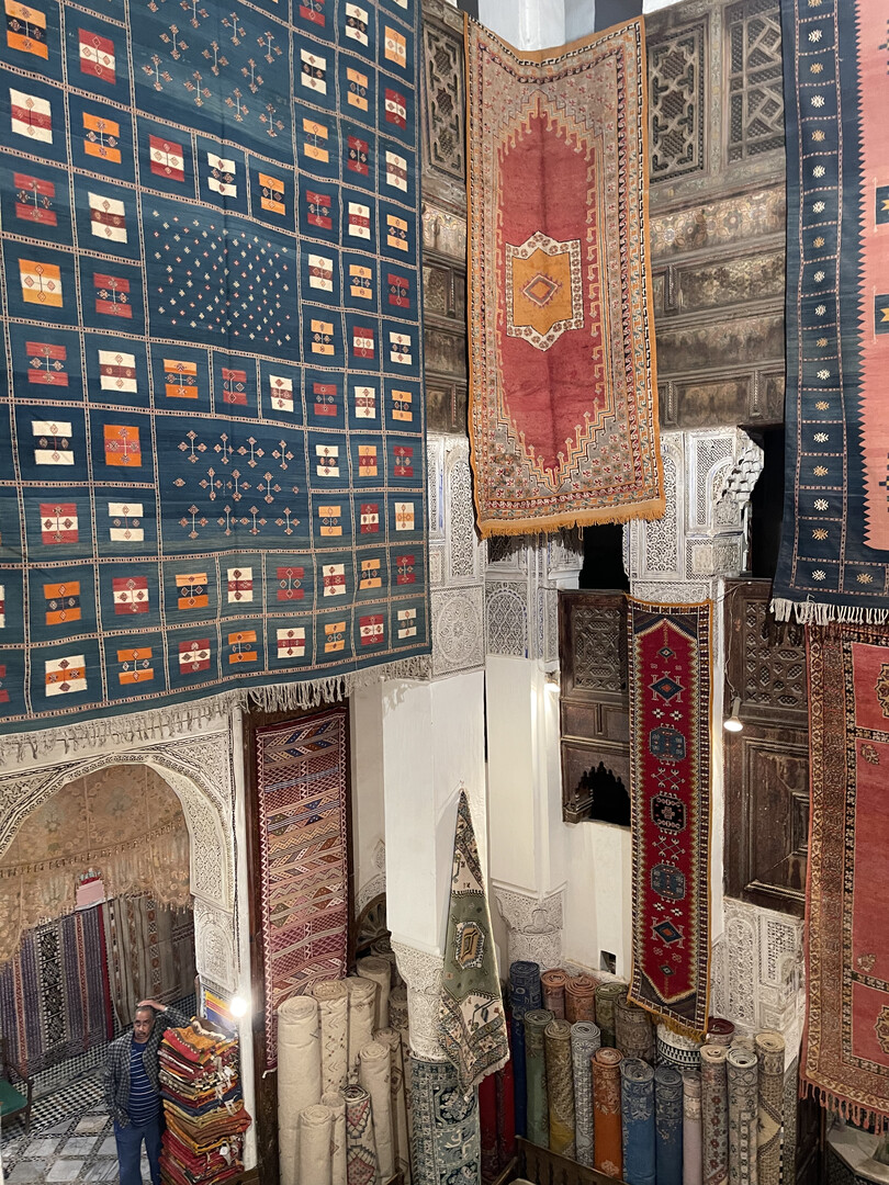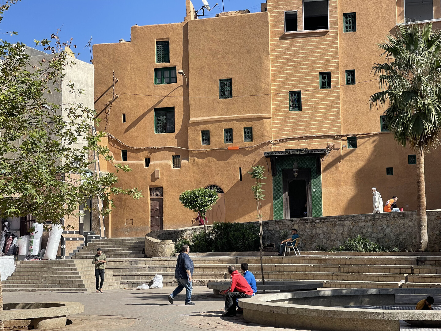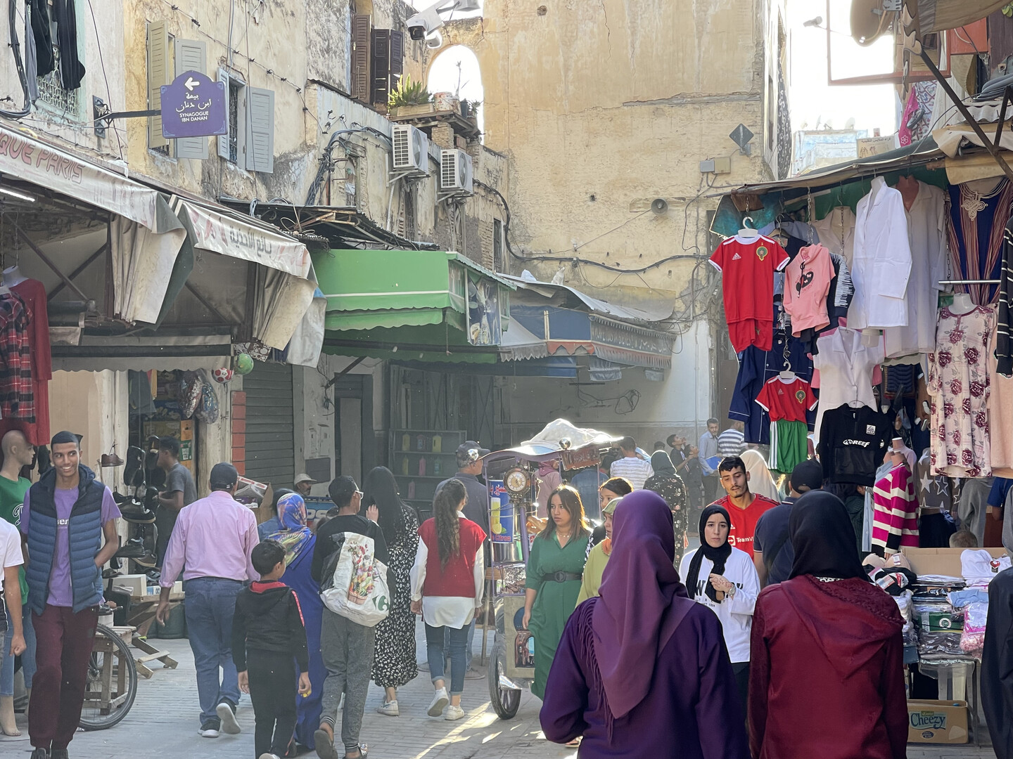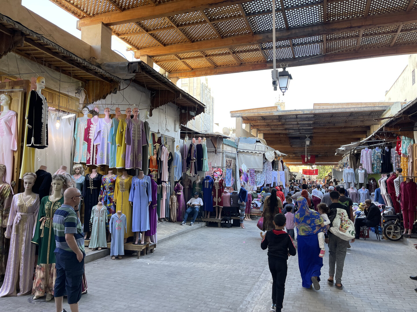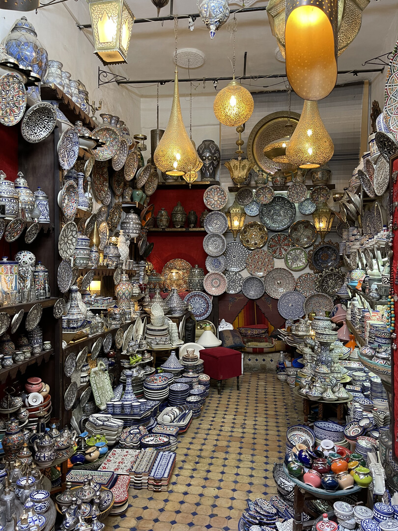 Past the park is a long pedestrianized avenue of clothing and jewelery shops that was supposedly the Mellah. It was unclear where it started because all the men were uniformly swarthy and mustached, and quite a few Muslim women in Morocco go hijab-less, so there was no visible indication of anyone's creed. As far as I could tell, the only significant difference between the Jewish Quarter and the rest of the city was that synagogues charged entry fees while mosques did not. Upon further investigation, I learned that "in 1997 there were reportedly only 150 Jews in all of Fez and no functioning synagogues remained in the Mellahw," and I assume all the remaining Jews have since moved to Israel, so I guess the "Jewish Quarter" name is just window-dressing.